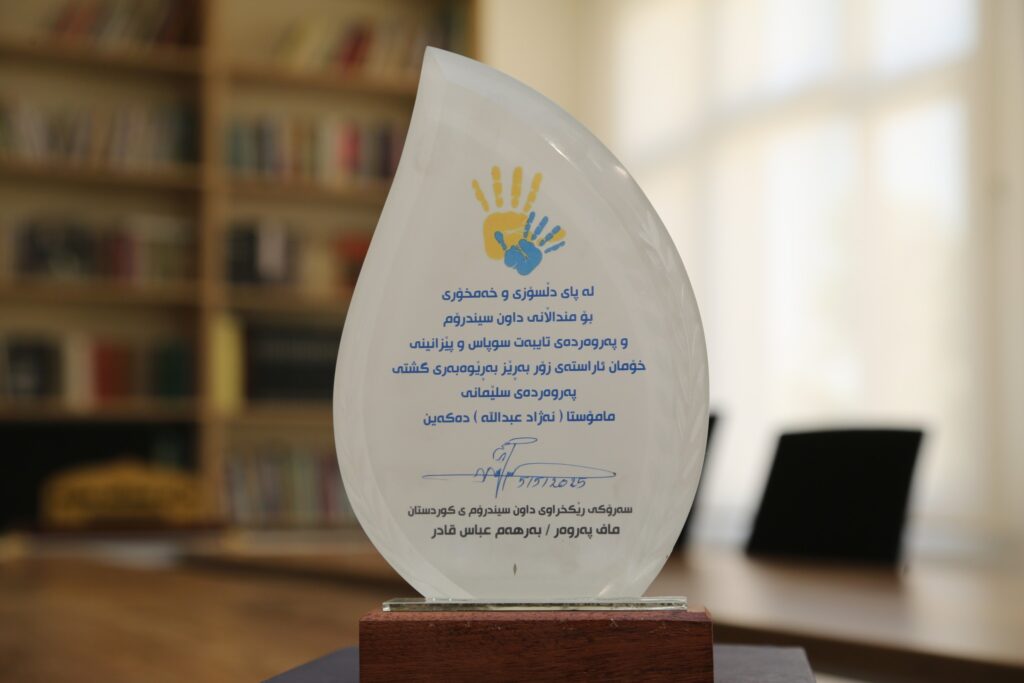 لەپاش هەوڵەكانی بەڕێوەبەری گشتی كە بەردەوام پاڵپشتی و خزمەت بە پەروەردەی تایبەت و منداڵانی داون سیندرۆم دەكات ، ئەمڕۆ چوارشەممە ٥ی١١ی٢٠٢٥ مامۆستا نەژاد عبداللە بەڕێوەبەری گشتی پەروەردەی سلێمانی سوپاس و پێزانینی لەلایەن بەرێز ماف پەروەر بەرهەم عباس قادر سەرۆكی ڕێكخراوی داون سیندرۆم ـی كوردستانەوە پێشكەش كرا.